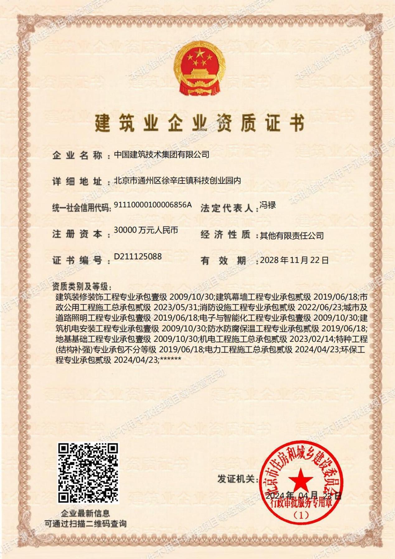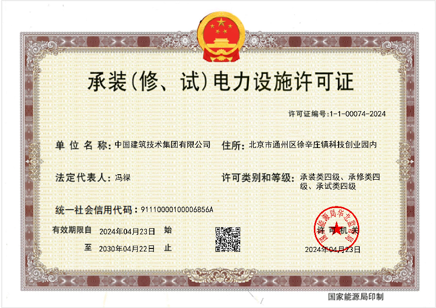 4月23日,經北京市住房和城鄉建設委員會、國家能源局華北監管局核準,中國建技申報的電力工程施工總承包貳級、環保工程專業承包貳級、承裝(修、試)電力設施許可證(四級)三項資質成功獲批。
